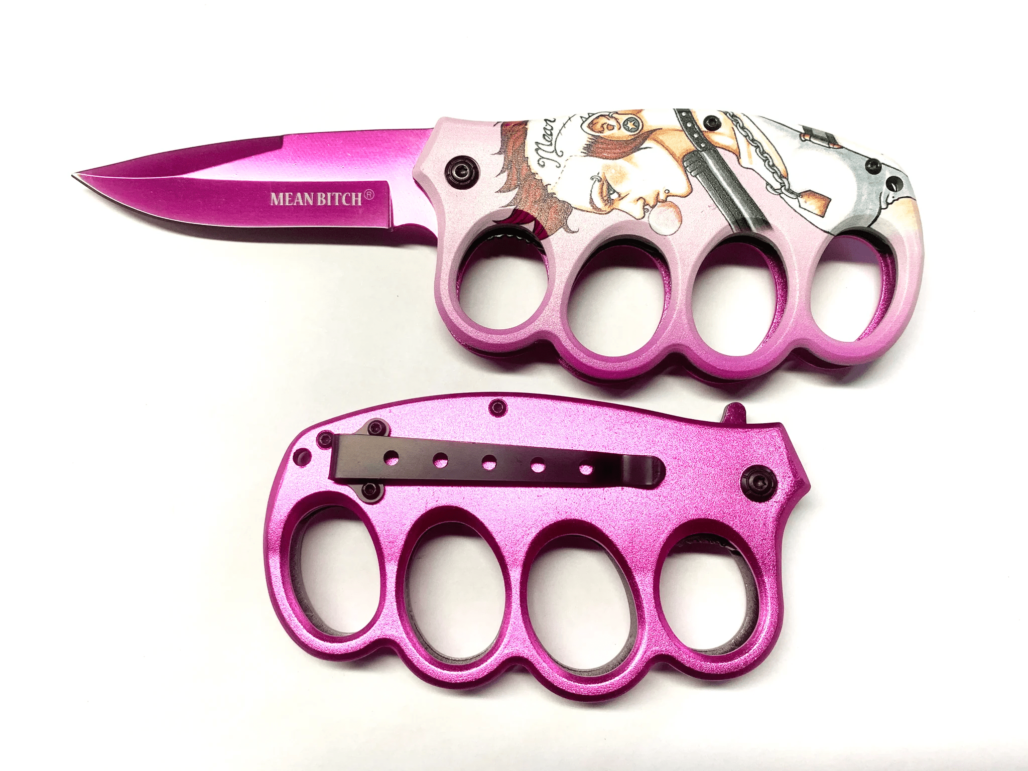Don’t let the color fool you—Pink Mayhem brings the pain with flair. This trench-style knife is equal parts bad attitude and bold fashion, decked out in a metallic pink finish with a wicked illustrated grip and “Mean Bitch” laser-etched right on the blade.